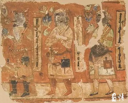 在她們的腦后垂有一條長(zhǎng)長(zhǎng)的紅色絹繩,幾乎垂地,很有特點(diǎn)。畫(huà)面右上方有回鶻文榜題“此是高貴的王后之像”。