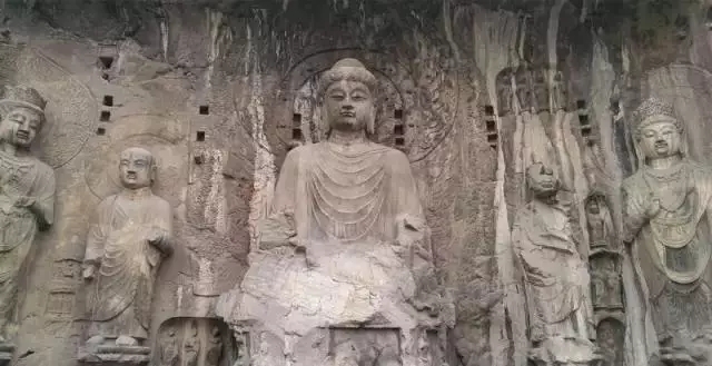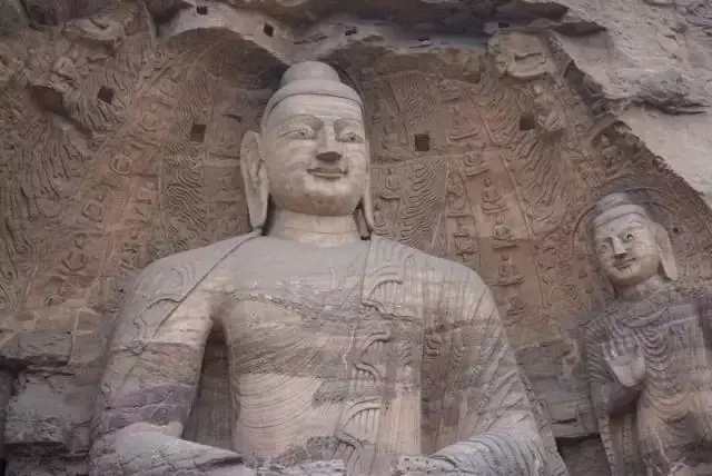 龍門盧舍那是公認(rèn)最美的大佛,以神秘微笑著稱。該洞窟龕制為一佛、二弟子、二菩薩、二天王、二力士,一鋪九尊式組合,窟內(nèi)壁面裝飾浮雕較為繁密。主像高17米有余,是龍門石窟中規(guī)模最大者.當(dāng)我們放任視線游弋九尊造像之間,會不知不覺被主佛吸引,自然的將目光停落在她的微笑,于是我們發(fā)現(xiàn)這個微笑具有不可抗拒的魔力。