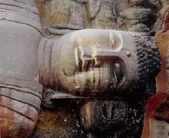 該像成于盛唐,高度繁榮的社會,藝術(shù)氣氛具有郁勃濃烈的浪漫氣質(zhì),佛教造像同樣富于激情和感染力。臥佛頭身比例8:1,符合中國古代繪畫中臥式形象的要求,“秀骨清像”風(fēng)格尤甚,給微笑平添東方風(fēng)韻。距地5米,長22米的規(guī)模,給人的震撼是驚人的,如此巨制刻在崖壁上,一般不會精雕細琢,很難有精彩的作品。但此像卻運用概括粗獷的手法,通過巧妙合理的布局和節(jié)奏感,顯得自如傳神。