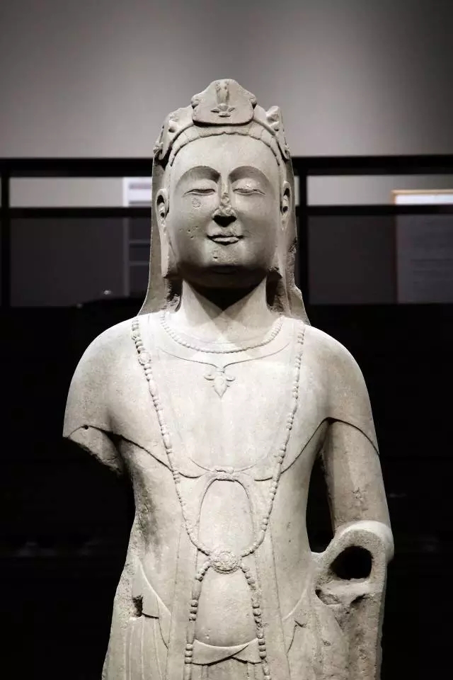 青州菩薩像因為是窖藏出土,造像原來所處的形式布局蕩然無存,我們無法欣賞,只能將目光視線集中在塑像上,這樣反而更較容易感受的微笑的情感和形式魅力。