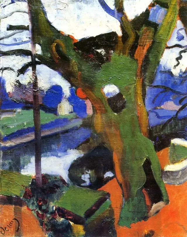 德朗早期的作品使用的是分段色塊、快速的曲線和生硬的顏色,手法并不粗野,筆下的線條還算典雅,色彩也還和諧。他所采用的主要顏色是綠色、藍(lán)色、以及從玫瑰紅到深紫的所有紫色。