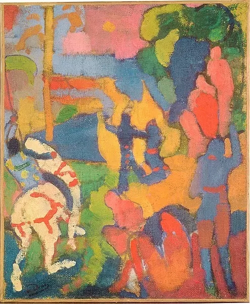 在畫中他賦予了色彩以獨(dú)立的地位,明亮的紅、黃、藍(lán)、綠等色彩構(gòu)成了強(qiáng)烈而和諧的對(duì)比。畫中色彩具有爆炸的耀眼光芒,令觀者振奮。