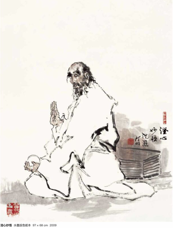 就傳統(tǒng)而言,中國(guó)古代的人物畫,由色彩美麗的精工描繪到水墨線條的勾勒以至于墨色氤氳,元?dú)饬芾欤步?jīng)歷了由色入墨的過程。沈默是一位有深厚修養(yǎng)的畫家,他在這兩幅新作中所做的嘗試完全符合中國(guó)人物畫的發(fā)展軌跡。而其用筆用墨用色,講究蘊(yùn)藉、渾厚、和諧,迴避大面積的渲染,不采用隨心所欲的潑墨,別有一種大巧若拙的韻味,彌足珍貴。