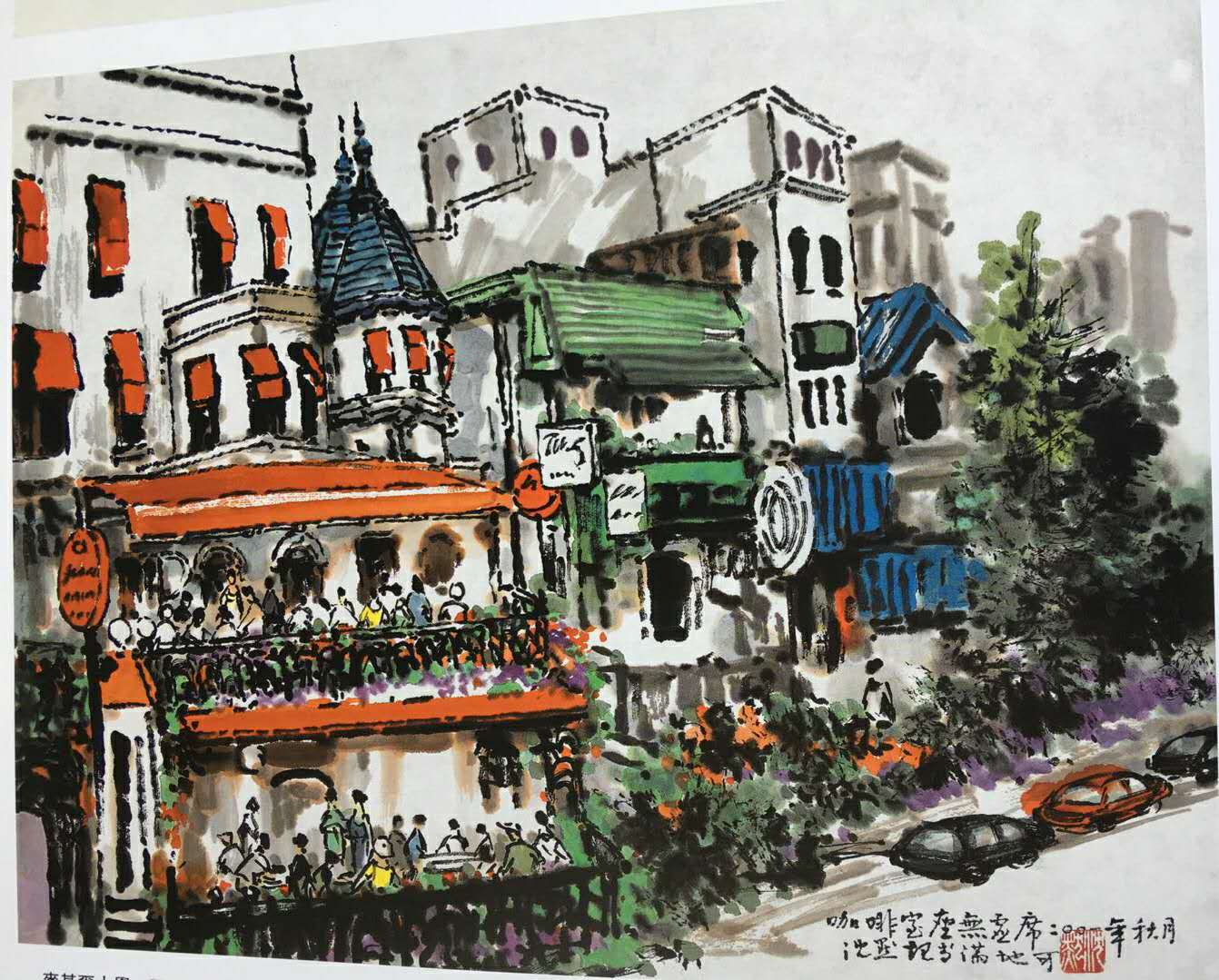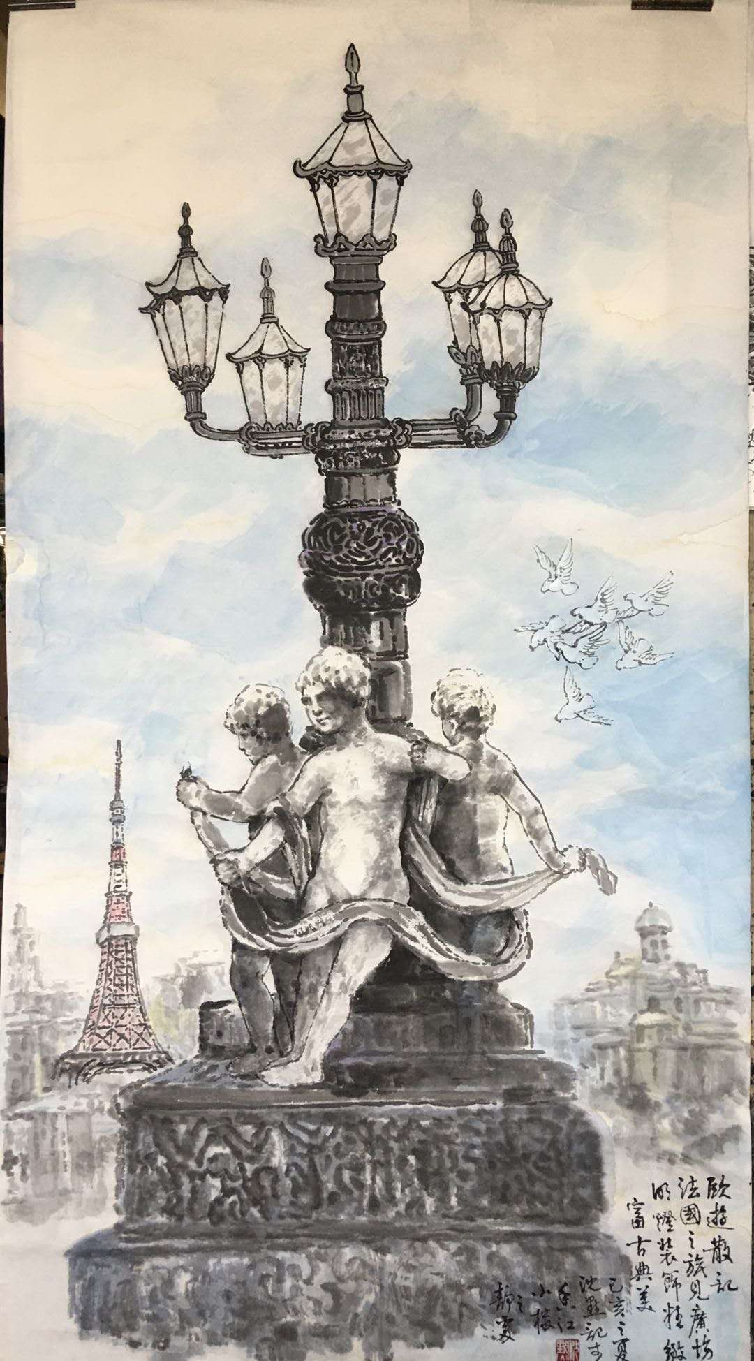 另一副巴黎街頭所見,則運(yùn)用了明顯的立體透視,將景深盡量拉長(zhǎng),巍然挺立的巴黎鐵塔反倒成了小小的陪襯。這樣,此件街頭常見的雕塑不再是孤立的存在,他彷若時(shí)光隧道的一個(gè)站臺(tái),占據(jù)了歷史和現(xiàn)實(shí)的廣闊空間;那幾盞頗具古典格調(diào)的風(fēng)燈用或濃或淡、或粗或細(xì)的墨線勾出,參差錯(cuò)落,華燈隱曜,顯示了上乘的中國(guó)畫的筆墨功夫。
