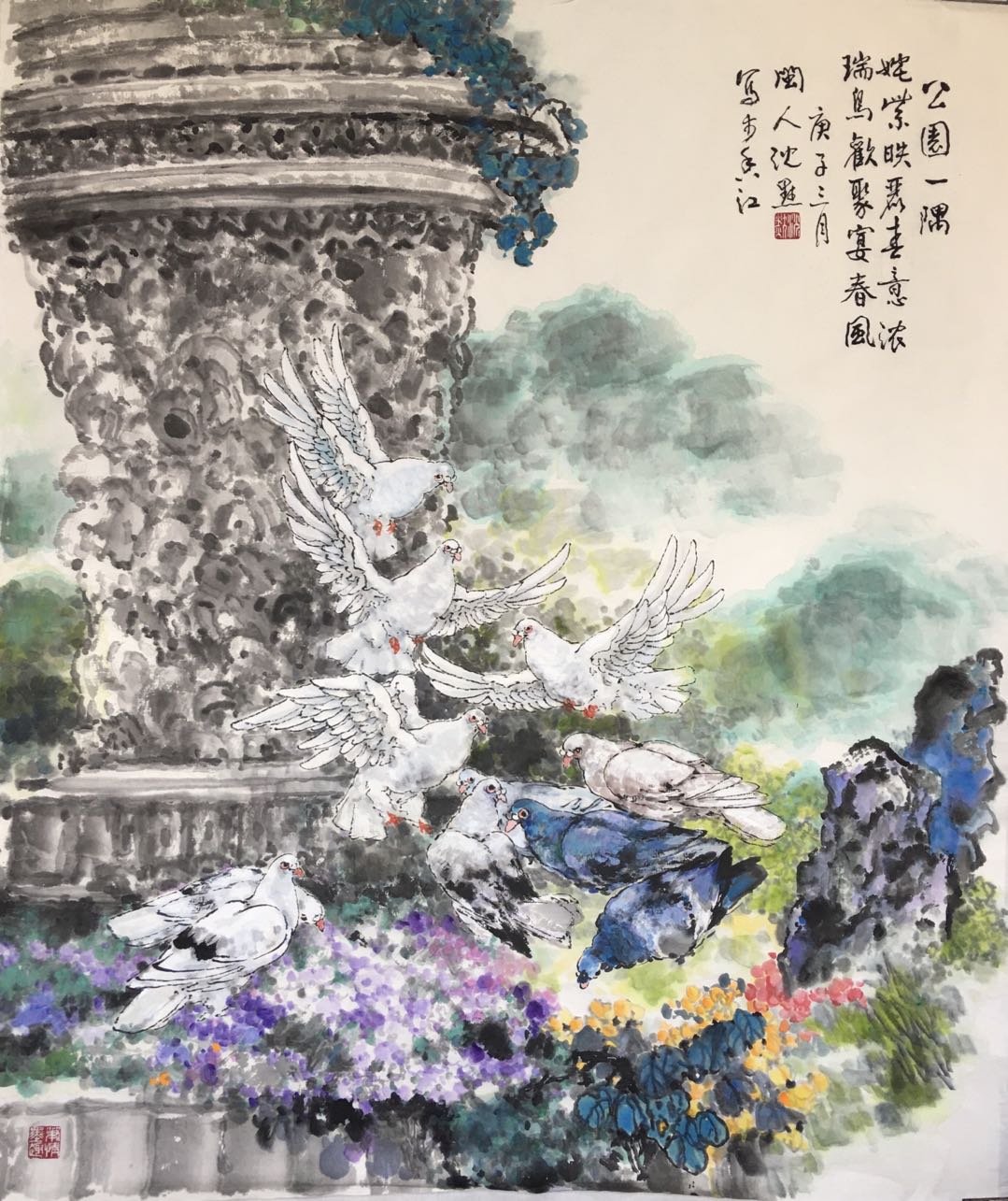 翻飛的鴿群,繽紛的鮮花,甚至右前方的華燈都不是固有的實(shí)景?;蛘呒脑嫾业淖鸪纾?yàn)闃?gòu)畫所需,或者用于色彩的對(duì)比。盡管著筆細(xì)膩,生意盎然,但欣賞者的目光還是被雄偉、堅(jiān)實(shí)、厚重、有立體感、具金屬硬度的雕塑所吸引。那高聳的乳胸,渾圓的臂肌,緊握尖刀的手,甚至臉上繃緊的肌肉,吶喊的口形,翻捲的旗幟,每一筆都蘊(yùn)含著憤怒和力量,閃耀生命的光華。就連獅子頭部奮張的鬣毛,也有肌理可尋。筆的力度、線的規(guī)范、色的重輕以及光暗、結(jié)構(gòu),都處于高度和諧之中,而銅像背后的柱子更隱隱透露出大理石的晶瑩、溫潤(rùn)。以宣紙、水墨、少量的色為物質(zhì)材料,以毛筆為唯一工具,以國(guó)畫技法為本,追求青銅的可觸感,這才是畫家的著力處,是畫家的得意之筆 。