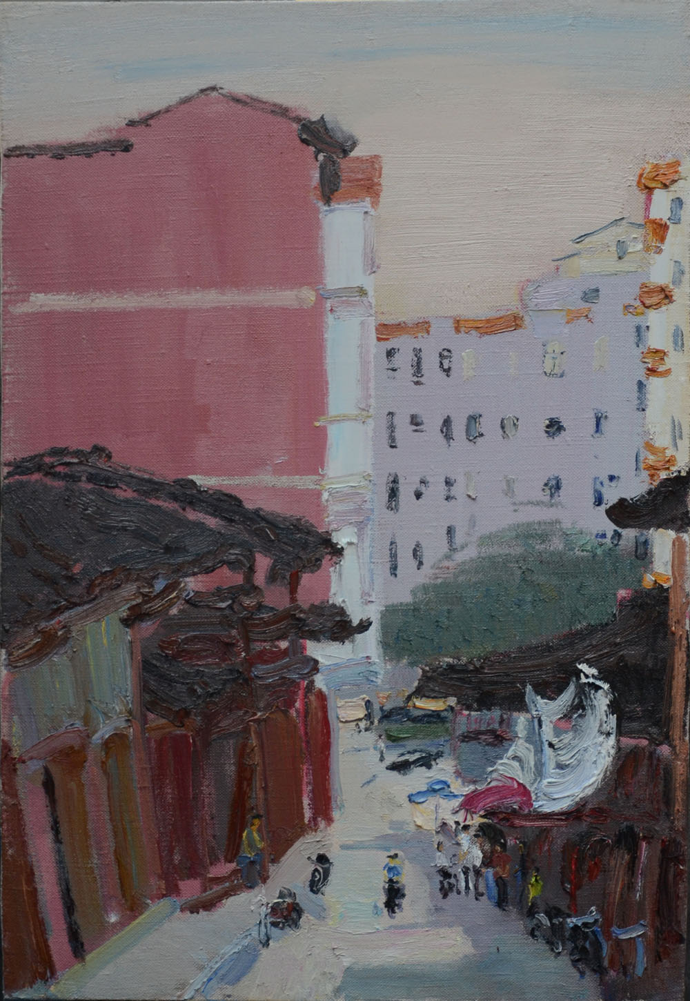 油畫作品《小街存古鎮(zhèn)》2018年入選紀(jì)念改革開放四十周年正青春福建省青年美術(shù)作品展。(福建省美術(shù)家協(xié)會)