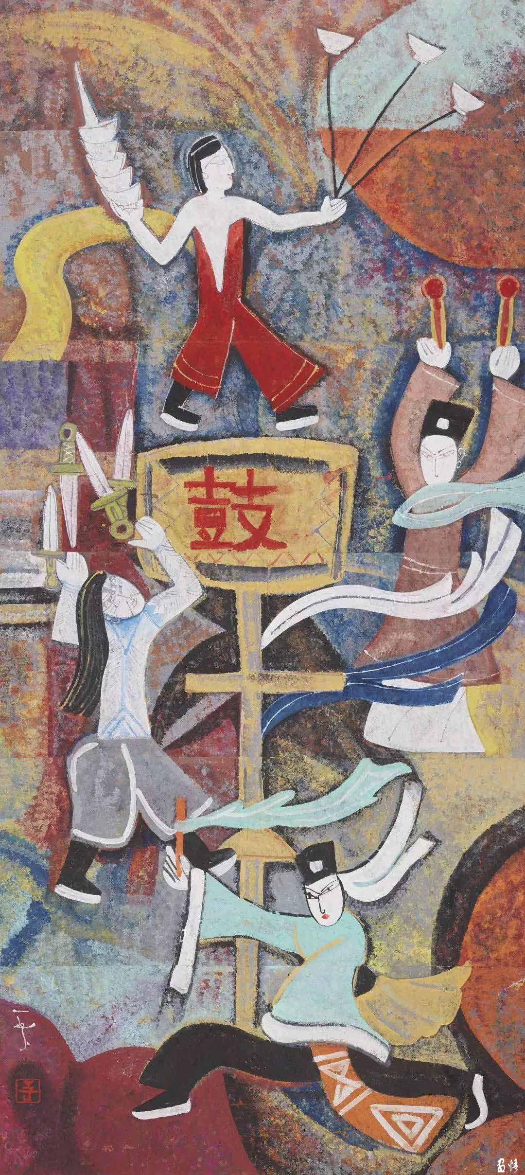 丁雄泉 《紫衣攬鏡少女與藍(lán)馬》182×97cm×3 紙本彩墨、丙烯