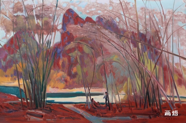 志洋是個充滿激情的人,但他能把澎湃的激情及對人生的理解,以高度的理性約束在可控的藝術(shù)語言內(nèi),有激情沒有偏激,有情緒拒絕狹隘,雖濃烈但透露著平靜,呈現(xiàn)出安祥。畫面的審美情調(diào),不似西方的交響樂奏岀的鏗鏘之音,而更像中國民族樂器彈撥出的輕松、輕柔、清新之調(diào),如彩云追月,似高山流水?!氨M可能的以簡潔的意象替代寫實的物象,注重個人意緒的流露和抒發(fā),盡力讓畫中漫著詩情,讓民族情節(jié)和審美情趣得以詮釋”,在我看來,志洋兄的這句話是他對自己藝術(shù)的最佳詮釋。