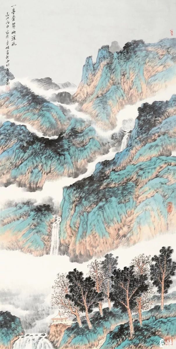 ▲李明作品 《一亭蒼翠映溪流》 138cm×69cm