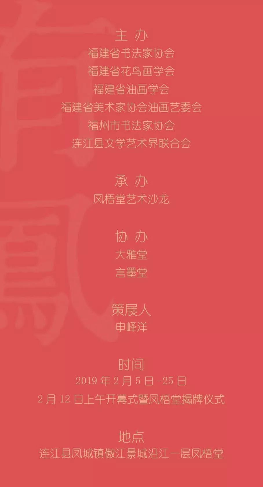 有鳳來儀——連江籍書畫名家(五人)賀歲展,展出時間2019年2月5日-25日,2月12日上午舉行開幕式暨鳳梧堂揭牌儀式,敬請蒞臨!
