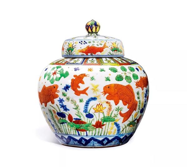 明嘉靖 五彩魚(yú)藻紋蓋罐 佳士得香港2017秋拍 “樂(lè)從堂藏明代宮廷珍器晚間拍賣”