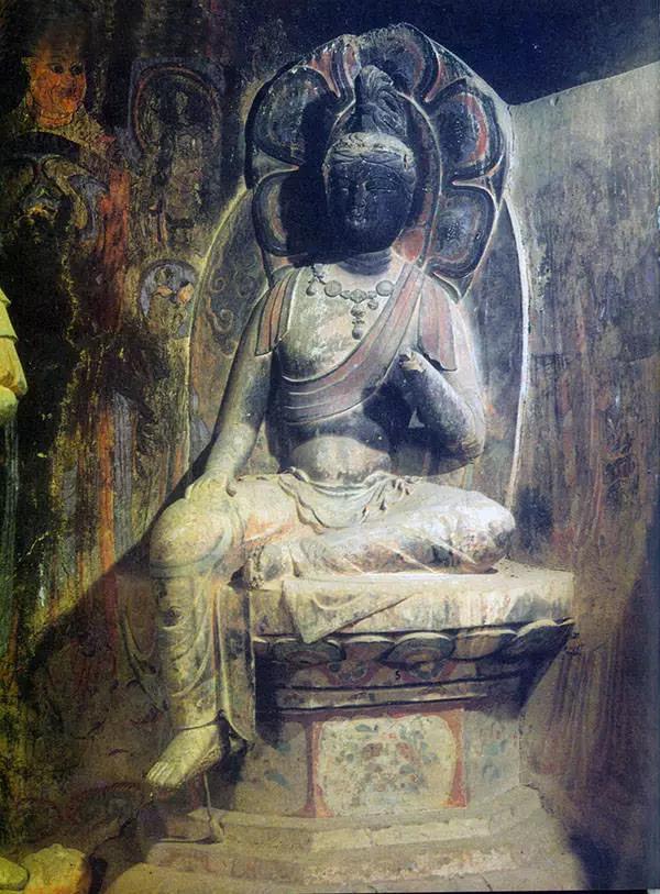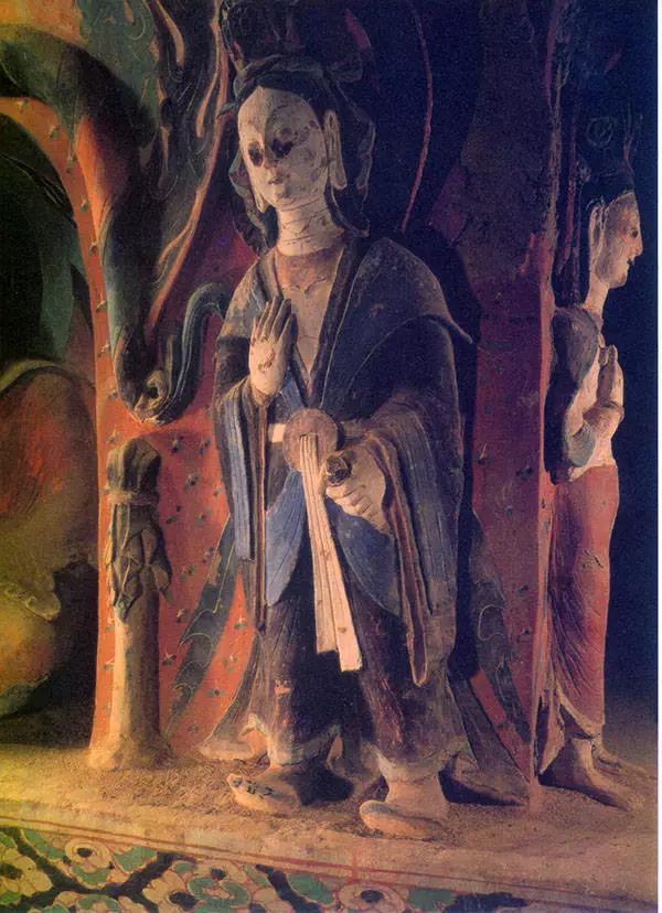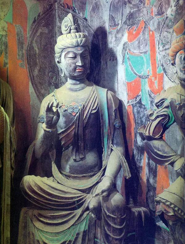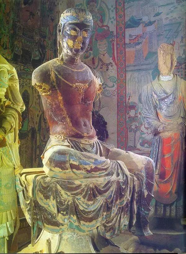 敦煌莫高窟的石窟造像主要是泥塑,因均施彩繪,故稱(chēng)彩塑。顏料取之于天然礦石,色澤艷麗,顏色長(zhǎng)久不變。彩塑是洞窟的主體,一般位于正廳中間,主要塑佛像或菩薩像,四壁和頂上才是壁畫(huà),早期的洞窟,壁畫(huà)只是作為裝飾和陪襯出現(xiàn)的。