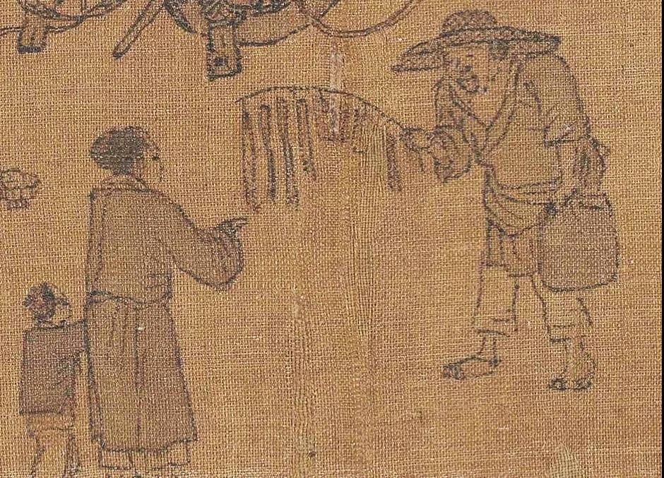 要說(shuō)到貨郎,李嵩筆下的這位是不可不提的。他扁擔(dān)兩頭的貨架都裝得滿(mǎn)滿(mǎn)當(dāng)當(dāng)?shù)?,貨架雖小卻密密麻麻塞滿(mǎn)各種小玩意。